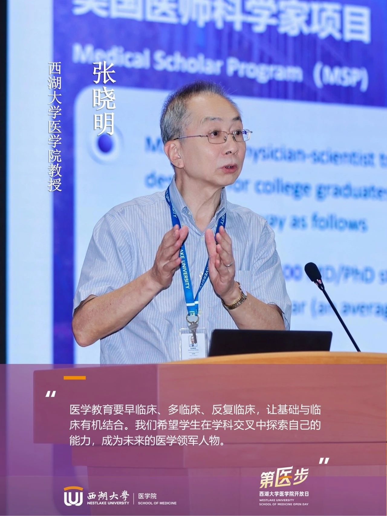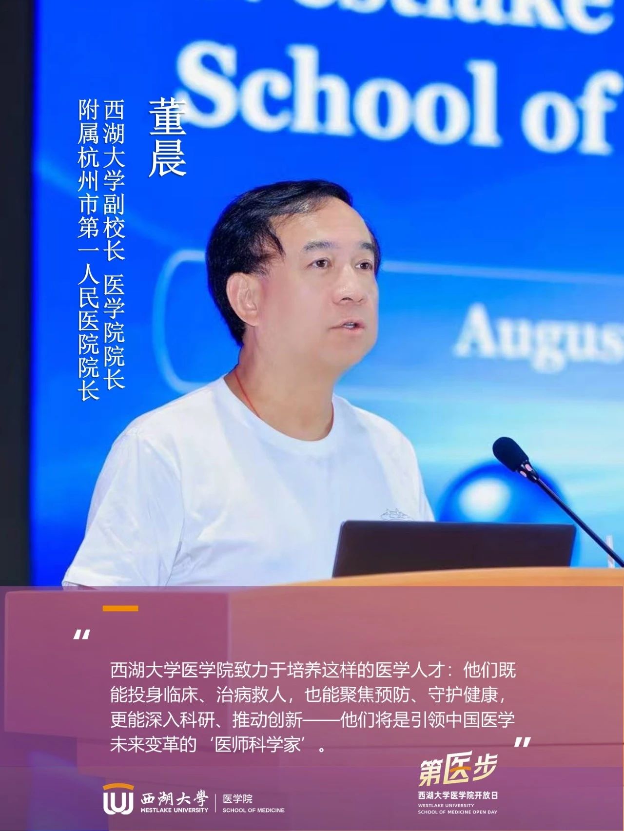 活动伊始,西湖大学副校长兼医学院院长、附属杭州市第一人民医院院长董晨走上讲台,介绍了学院的办学理念、师资力量、培养路径与长远规划。他强调,医学院的使命在于塑造一批兼具国际视野、科研素养与临床能力的“医师科学家”,为中国医学教育改革与全民健康事业注入新的活力。