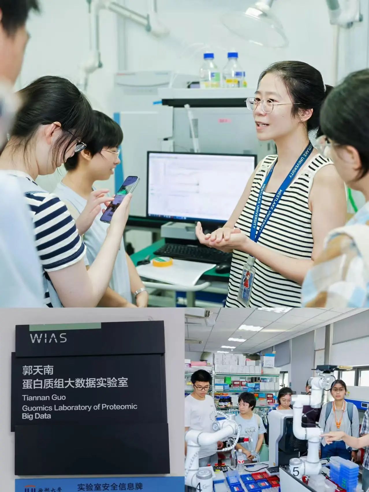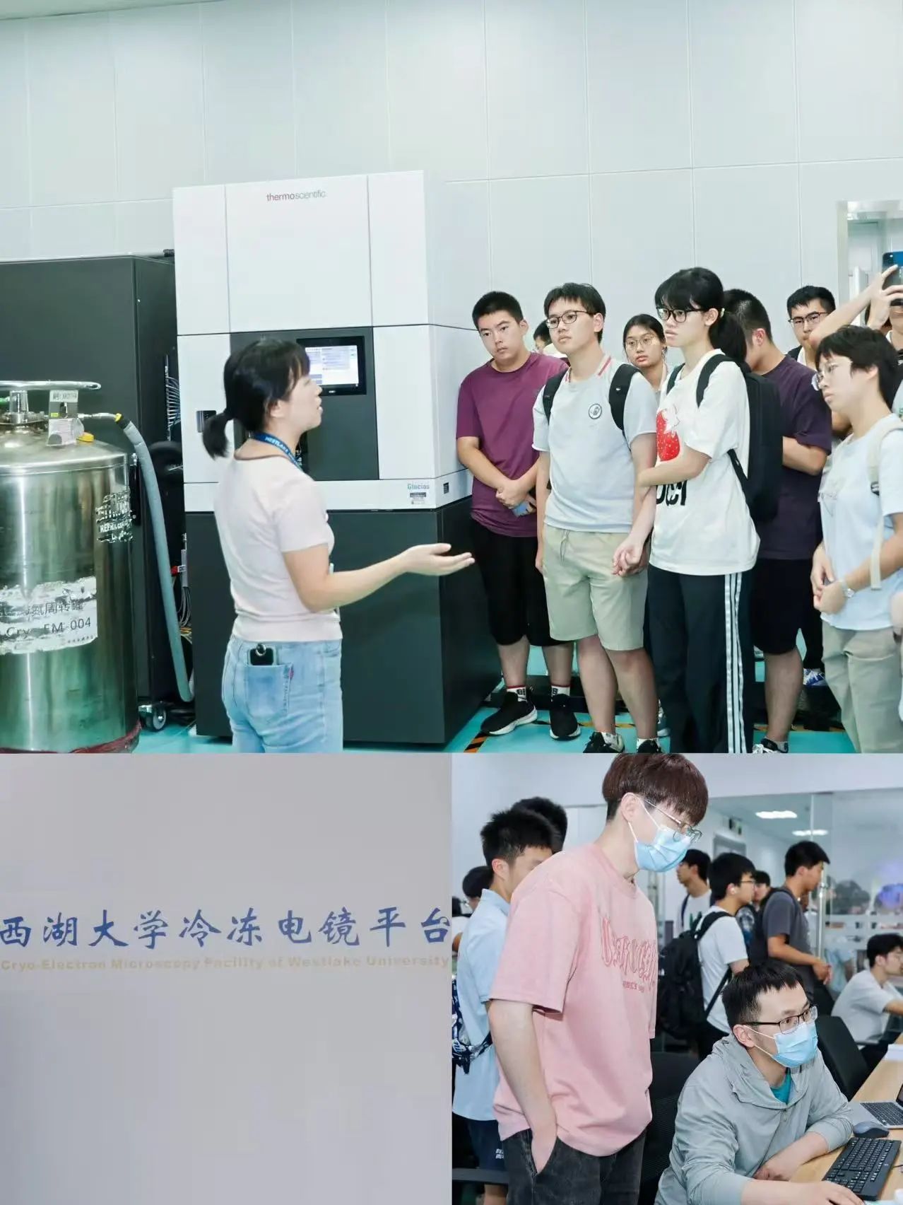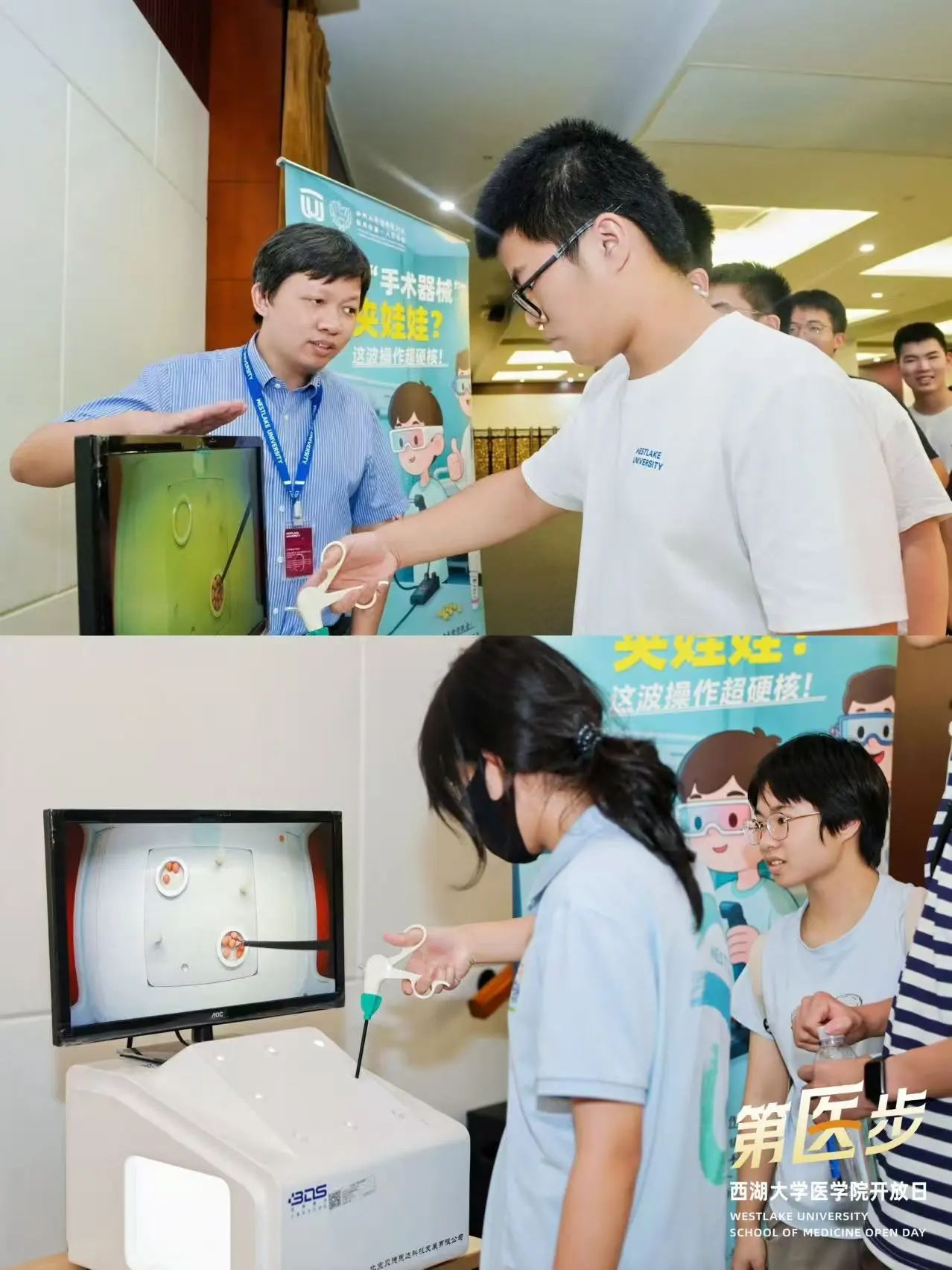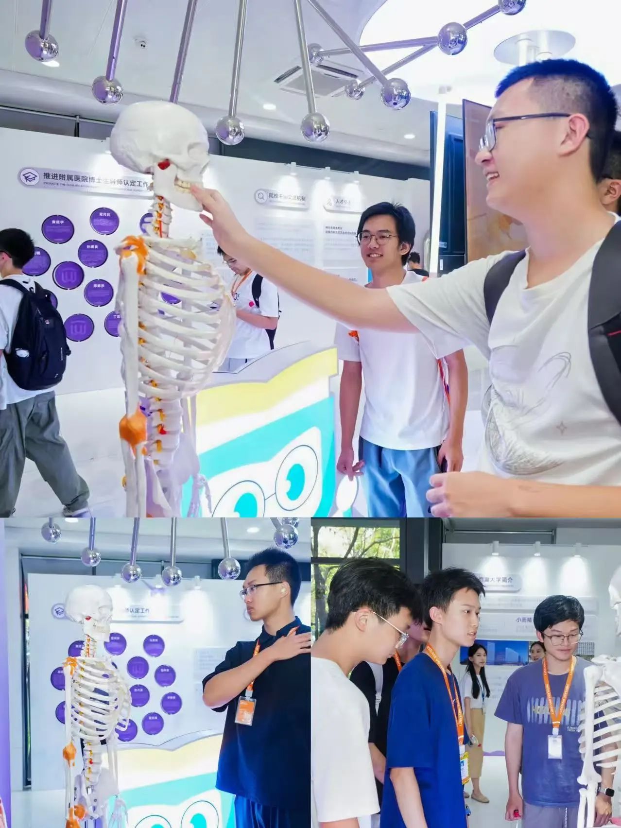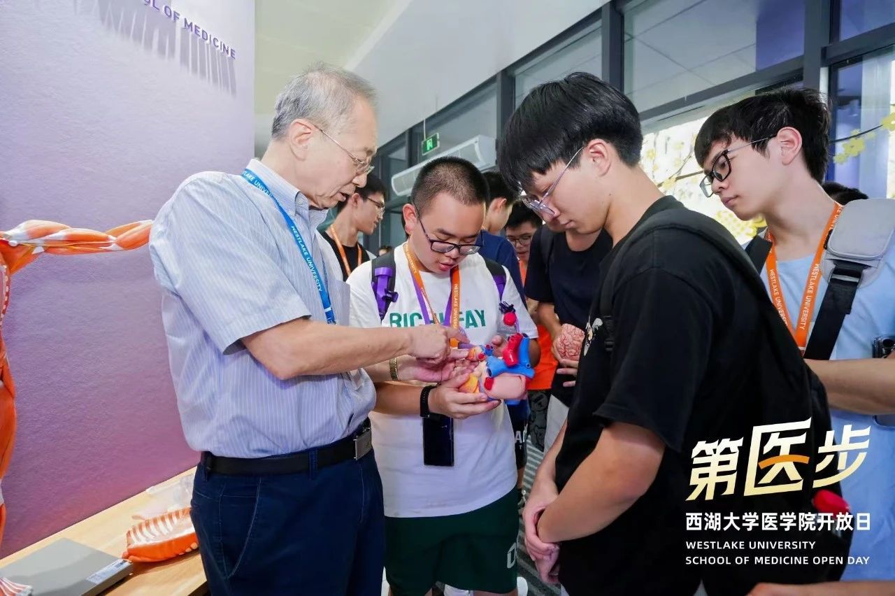 午后,载满同学的大巴驶向西湖大学云栖校区,更加丰富的体验环节陆续展开:精彩的海报及展厅展览,全面呈现医学院科研团队的主要方向与最新进展;在实验室与冷冻电镜平台,同学们认真聆听讲解、积极发问,此起彼伏的问答让现场变为一个个“小型讨论会”;附属医院展区则安排了“用手术刀夹小球”的互动游戏,在趣味中传递精准操作的理念,笑声不断;而在人体解剖模型前,张晓明教授被同学们层层围住,他细致讲解骨的构成与功能,仿佛开启了一堂生动的医学公开课。