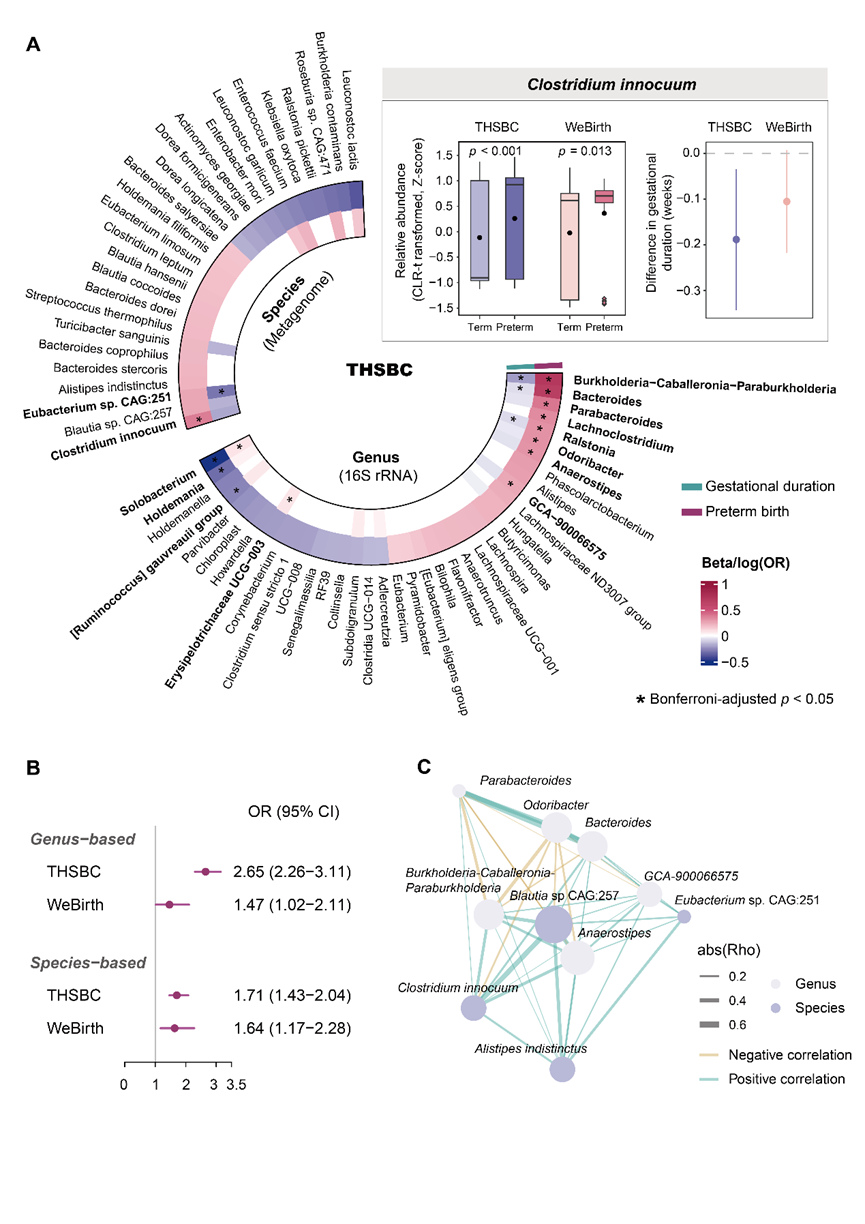 该项目依托多个出生队列开展:同济-华西-双流出生队列(Tongji-Huaxi-Shuangliu Birth Cohort,THSBC)及西湖精准出生队列研究(Westlake Precision Birth cohort,WeBirth)以及广州出生队列。其中WeBirth是西湖大学主导建立的精细化出生队列研究。研究团队系统收集并分析了发现队列(THSBC)中4,286名孕妇的孕早期肠道菌群、宿主基因组、性激素等多维数据,并对所有参与者持续随访至分娩阶段。为揭示孕早期肠道菌群与妊娠结局的关联,研究团队开展了微生物组关联分析(Microbiome-wide association study)。结果发现,11个菌属和1个菌种与早产风险相关;另有6个菌属和1个菌种与孕期长短存在显著关联(图2A)。值得关注的是,在菌种层面,无害梭菌Clostridium innocuum与早产风险的正相关性最为显著。这一关联在独立队列(WeBirth)中成功进行了验证。
