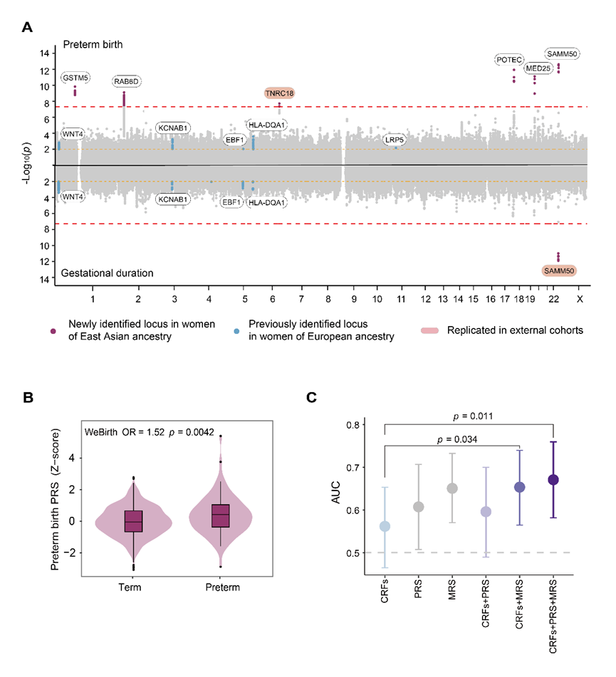 除肠道菌群外,已有研究提示母体宿主基因组同样参与调控分娩发动。为此,本研究采用系统生物学整合分析的策略,探讨了母体宿主遗传风险与微生物风险对早产的协同作用。针对东亚人群早产遗传背景尚不明确的问题,团队首先基于发现队列开展了孕期长短与早产的全基因组关联分析(Genome-wide association study,图3A),相关结果在广州出生队列等外部队列中进行了验证,并据此构建了早产的多基因风险评分(Polygenic risk score,PRS,图3B)。在进一步整合MRS、PRS及传统风险因素后,早产预测模型性能显著提升(图3C),表明母体MRS与PRS存在交互作用,两者对早产风险显示出累加影响。