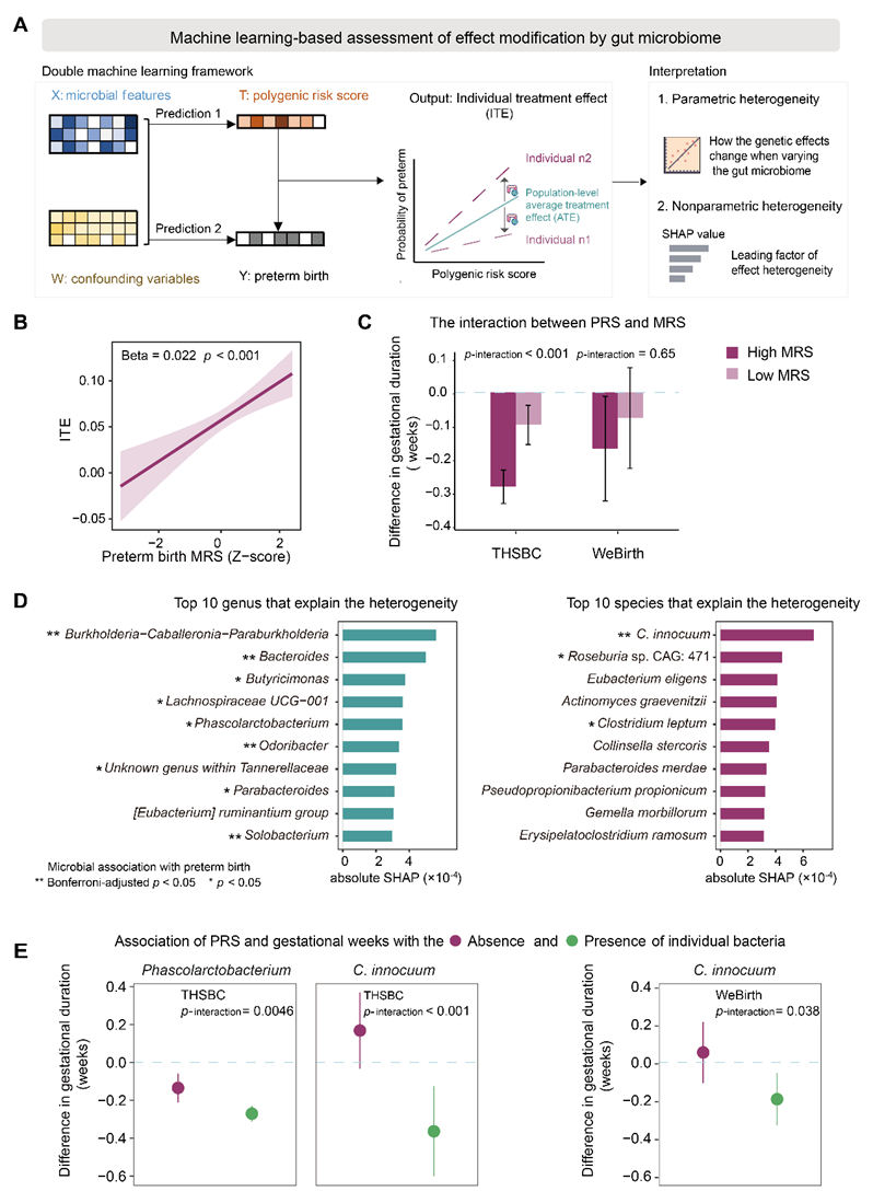 PRS和MRS的联合预测性能并非简单叠加,提示两者间可能存在潜在的交互效应。研究团队进一步分析了二者的交互作用。该分析面临一项关键挑战:需从观测数据及极高维度的微生物组数据中有效识别出可靠的交互信号。为解决这一难题,团队采用双重机器学习方法(Double Machine Learning,DML)这一因果推断方法,基于观察性数据识别宿主基因-肠道微生物间的交互作用(图4A)。DML能够在高维协变量环境中,有效估计特定干预(或暴露)对结局的效应是否受其他变量的修饰,尤其适用于像微生物组这样复杂高维的数据结构。研究结果显示,随着MRS的增加,PRS对早产的影响显著增强(图4B)。在发现和验证队列中,对比MRS较低的孕妇,MRS较高的孕妇中PRS与早产的关联强度更大(图4C)。有趣的是,在两个队列中,PRS与孕期长短的负相关关系在C. innocuum携带者中更为显著,而在非携带者中较弱(图4D-E)。这些发现表明母亲孕期MRS以及特定细菌可能是母亲宿主遗传风险影响早产的重要调节因子。