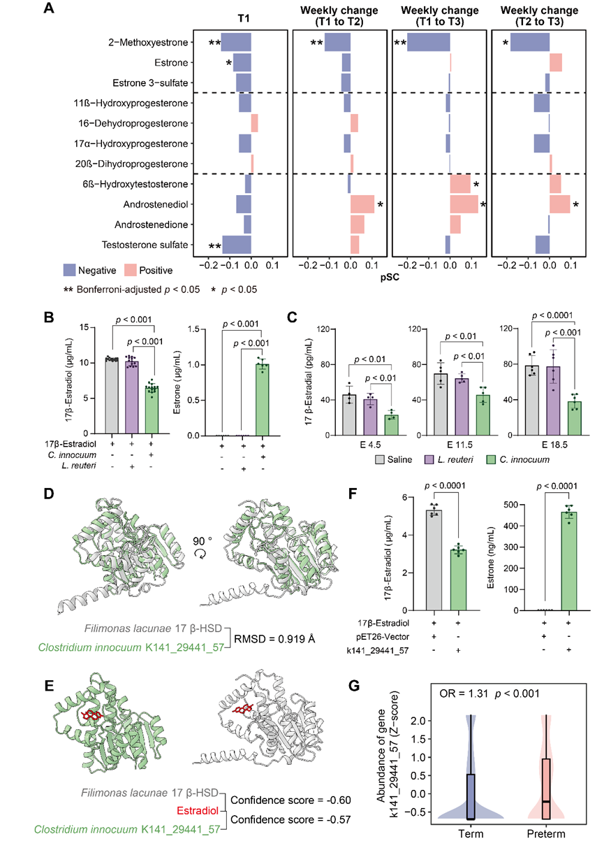 在所有关联菌中,C. innocuum经多队列验证,不仅与早产直接相关,还能够调节母体遗传背景对早产风险的影响。为深入解析该菌在早产中的生物学机制,研究团队开展了一系列功能实验。在人群层面,团队基于THSBC队列发现该菌相对丰度与2-甲氧基雌酮及其孕期的增加程度均呈显著负相关(图5A)。在机制层面,研究人员利用体外共培养体系证明,C. innocuum能够有效降解17β-雌二醇,并将其转化为活性较弱的代谢产物雌酮(图5B)。进一步的体内实验通过ELISA检测发现,定植该菌的孕鼠体内雌二醇水平显著降低(图5C)。通过宏基因组功能预测、结构同源比较和分子对接分析(图5D-E),研究团队发现C. innocuum携带一个新型雌二醇降解基因(k141_29441_57)。异源表达实验证实,该基因编码的酶能够有效降解17β-雌二醇(图5F)。值得注意的是,该基因在早产孕妇的孕早期的粪便样本中已出现显著富集现象(图5G)。上述结果从人群观察到体内外功能验证,系统揭示了“肠道微生物-雌激素轴”在早产发生中的潜在作用机制。