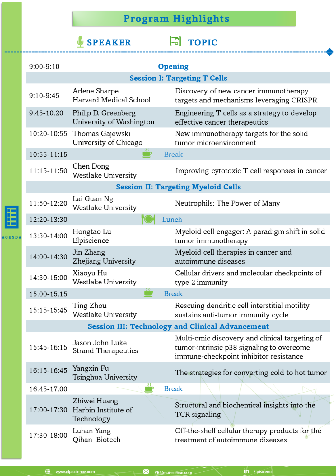 本次研讨会云集了来自哈佛大学、华盛顿大学、芝加哥大学、西湖大学、清华大学等顶尖学府的专家学者,以及产业界的领军人物。他们将围绕T细胞工程、髓系细胞机制、肿瘤微环境、CRISPR 免疫靶点、树突状细胞与粒细胞功能、转化医学策略等多个方向,全面展现了免疫治疗的最新突破与未来趋势。