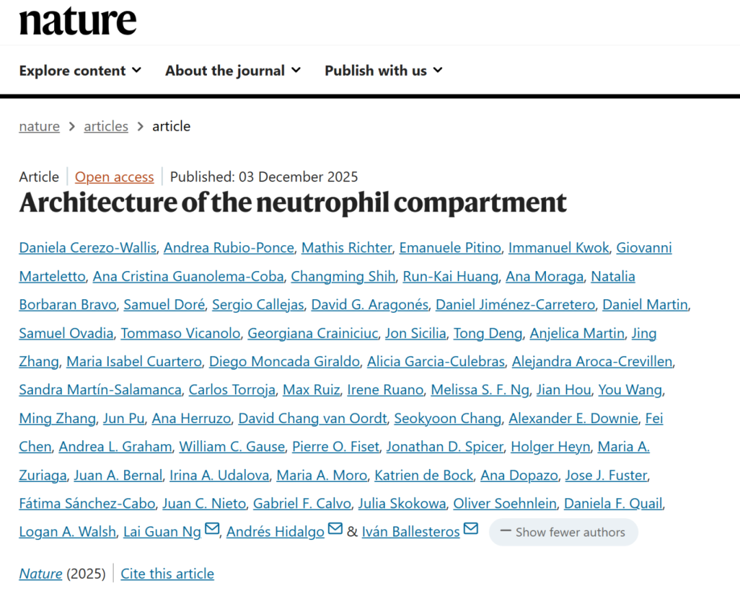 2025年12月3日,西湖大学医学院Ng Lai Guan教授与西班牙马德里卡洛斯三世大学Iván Ballesteros教授以及耶鲁大学Andrés Hidalgo教授合作,在国际顶级学术期刊Nature上在线发表了题为 Architecture of the neutrophil compartment 的研究论文。