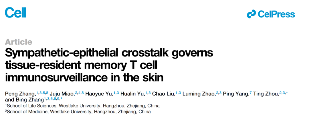 2026年1月29日,西湖大学生命科学学院张兵团队与医学院周挺团队在 Cell 发表联合研究论文“Sympathetic-Epithelial Crosstalk Governs Tissue-Resident Memory T Cell Immunosurveillance in the Skin”。研究首次系统阐明交感神经直接接触并支配上皮层,并通过上皮细胞分泌信号在稳态条件下持续动态调节局部组织内TRM的规模,从而调控皮肤的免疫监视强度。这项研究将机体的系统性精神压力反应与局部组织内的免疫稳态维持建立清晰的机制连接,为理解“精神压力—神经活动—免疫监视波动”的因果链条提供了关键证据与研究框架。
