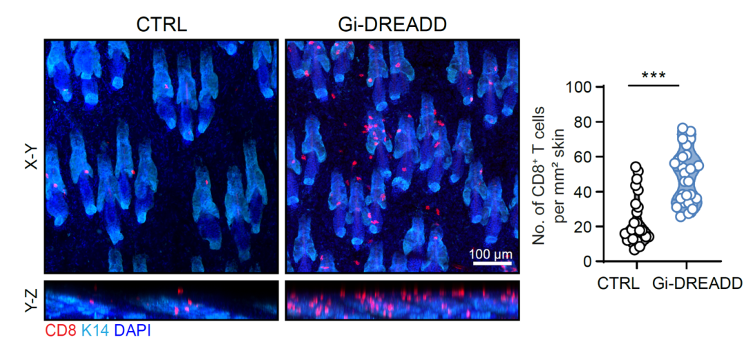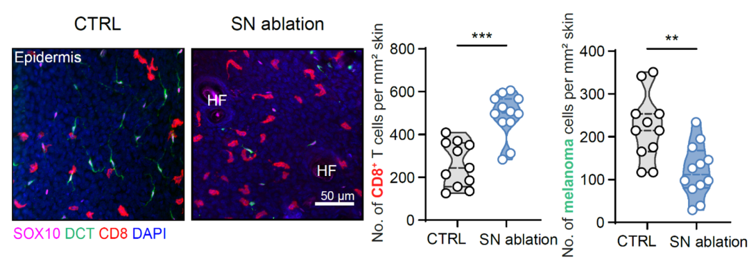 研究首先发现,当局部皮肤交感神经支配被削弱或神经活动被抑制时,皮肤内CD8⁺ TRM数量显著增加(下图);而当交感神经信号恢复后,TRM数量回落至基线,表现出动态、可逆的调控特征。这一结果表明,交感神经活性决定了组织内有多少“免疫哨兵”长期驻扎,从而设定了局部的基础免疫强度。