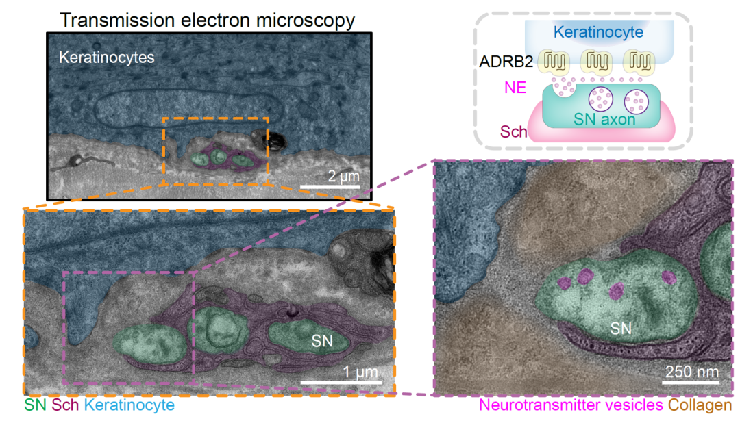 在机制层面,研究揭示交感神经并不通过直接作用于TRM实现调控,而是依赖“神经—上皮”轴进行信号中继。交感神经末梢释放去甲肾上腺素(NE),阻断β肾上腺素能受体可显著增加皮肤TRM;单细胞转录组结果进一步指出,β2肾上腺素能受体Adrb2在皮肤中角质层(上皮)细胞中表达量最高。高分辨率成像与电镜观察发现,部分交感神经末端延伸至表皮基底层附近,并在上皮细胞周围形成富含突触小泡的类突触结构(下图,绿色为交感神经,紫色为分泌囊泡,蓝色为上皮细胞),为NE对上皮细胞的精准递送提供形态学依据。遗传学验证同样支持这一中继模型:仅在上皮细胞中敲除Adrb2,就足以模拟交感神经抑制带来的TRM扩增;而在T细胞、髓系细胞或成纤维细胞中敲除Adrb2则不会产生相同效应,由此确立了“交感神经→上皮细胞→CD8⁺ TRM”的关键调控轴。