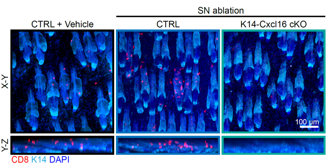 进一步研究显示交感神经抑制并未显著提升组织内TRM细胞的增殖,而是增强循环T细胞向皮肤的招募。分子机制方面,团队发现当交感神经信号降低时,上皮细胞上调关键趋化因子CXCL16,促进CXCR6⁺ CD8⁺ T细胞进入皮肤并在局部转化成TRM。当在上皮细胞中特异性敲除CXCL16,或者在T细胞中敲除CXCR6,交感神经抑制所诱导的TRM增加都会被完全消除(下图)。反之,在小鼠压力模型中,我们发现交感神经活性显著升高并下调上皮CXCL16表达水平,进而导致TRM数量下降。此外,我们还发现交感神经活性波动同样会影响和皮肤上皮类似的其他上皮类组织的CXCL16表达水平和TRM数量,例如鼻腔上皮和气道上皮。上述结果确立了“交感神经-NE/Adrb2-上皮CXCL16-CXCR6⁺ T细胞补给-TRM稳态”信号通路,证明了交感神经是通过改变上皮细胞的趋化能力,来决定组织内免疫监视强度。