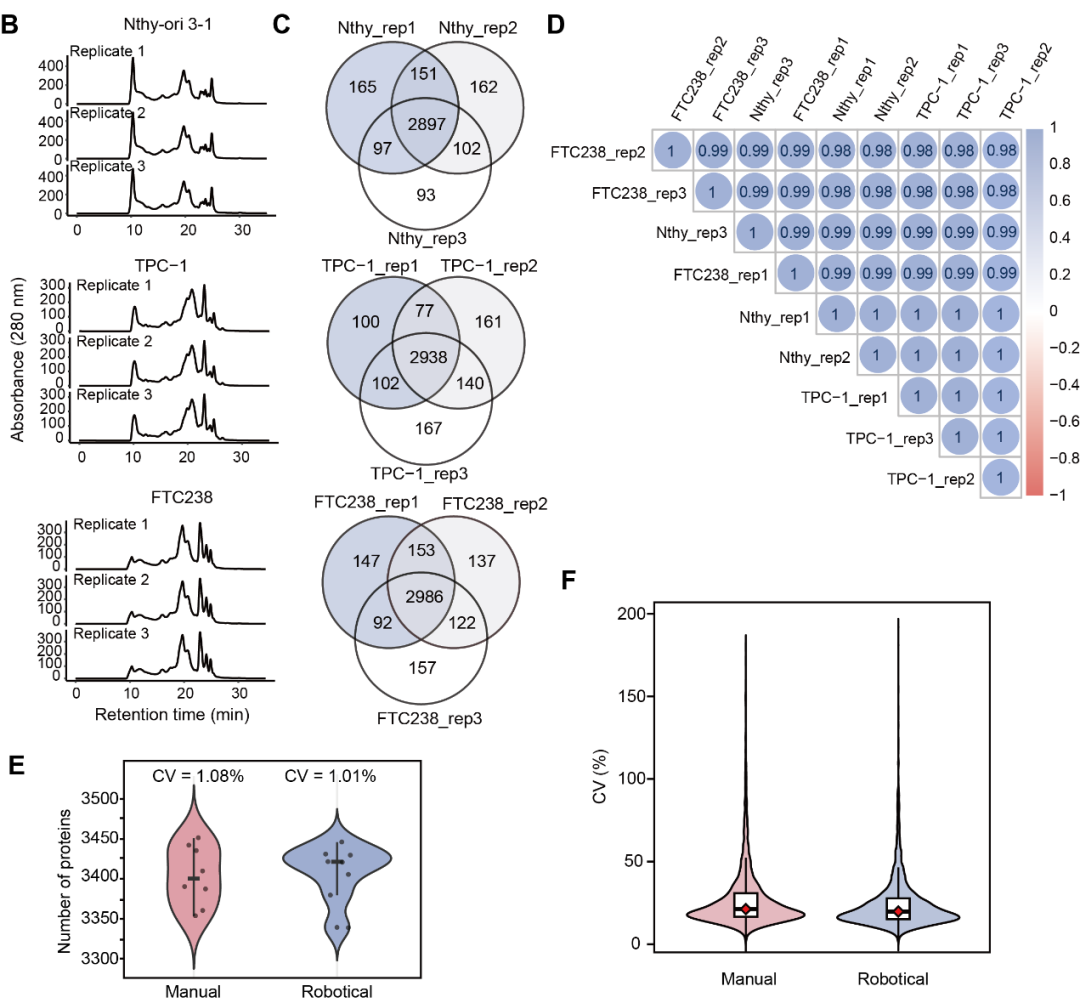 研究团队进一步将自动化实验平台与人工处理进行直接对比。以未分馏的TPC-1样本为例,自动化处理组的蛋白质数量变异系数(CV)由人工处理的蛋白质数量CV相比,从1.08%降至1.01%(图3E)。两组在蛋白质鉴定数量上高度一致:自动化处理为3408±34,人工处理为3404±37(图3B)。定量重复性分析显示,自动化处理组的中位CV更低(自动化组20.1% vs. 人工组21.6%),且四分位距更窄(自动化组12.6% vs. 人工组14.4%),体现出更稳定的定量性能(图3F)。