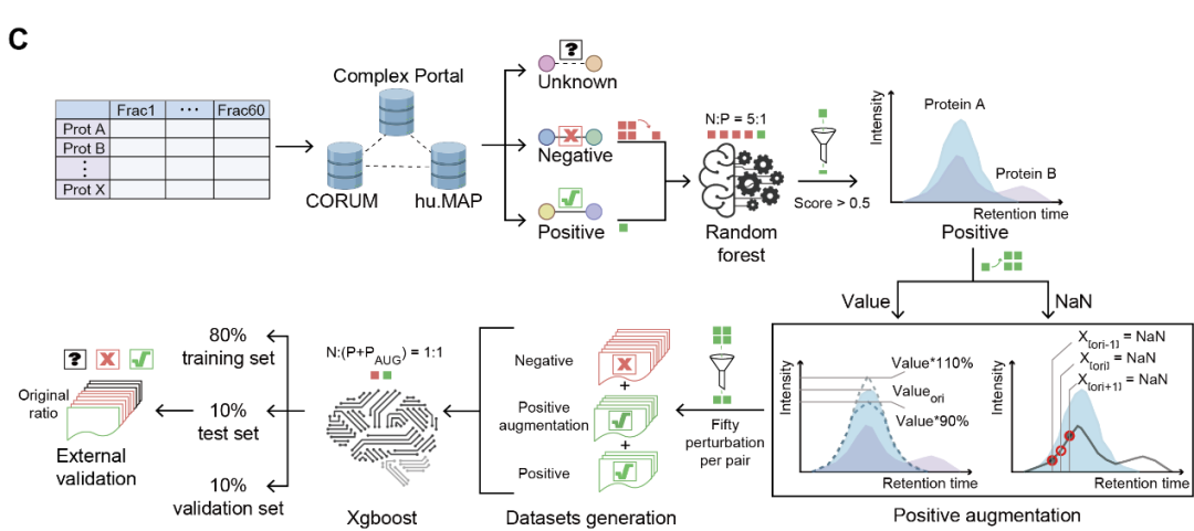 针对CF-MS数据的正样本(即已知真实PPIs)稀疏的问题,研究团队引入数据增强策略,通过对可靠的PPIs所产生的“共流出轨迹”数据进行随机扰动,扩增并多样化训练数据(图4),最终基于XGBoost构建预测模型。