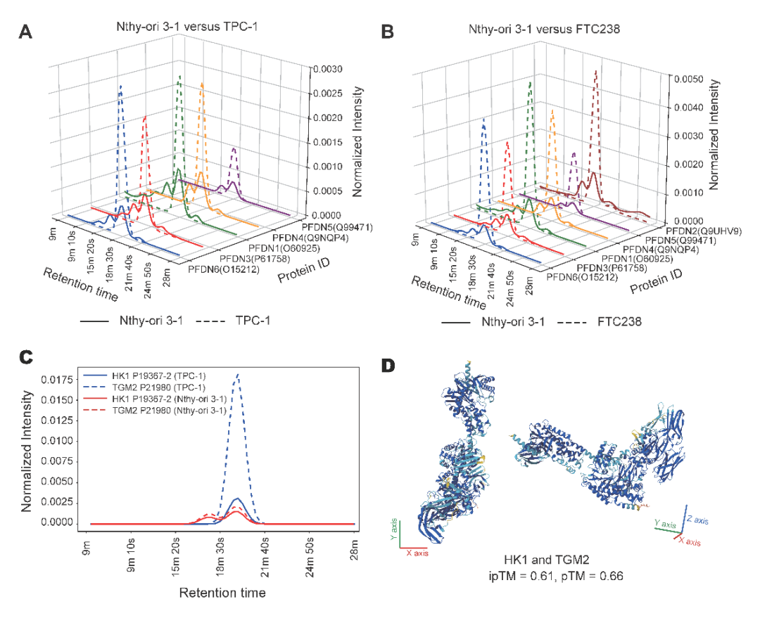 此外,研究团队预测并验证一对此前未被实验报道的PPI:己糖激酶 1(HK1)与转谷氨酰胺酶 2(TGM2)在TPC-1细胞中呈现协同增强的蛋白丰度信号(图5C)。HK1是糖酵解起始步骤的关键酶,而TGM2已被证明与肿瘤侵袭和转移密切相关。该结果提示乳头状甲状腺癌的侵袭性可能与代谢重编程过程存在直接耦联。AlphaFold3的结构预测进一步为该互作提供了中高置信度的结构支持(图5D)。